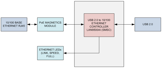 The 3.3V supply required to power the board comes from either the USB or the Ethernet port. The block diagram illustrates architecture of the USB to 10/100 RJ45 Ethernet converter.